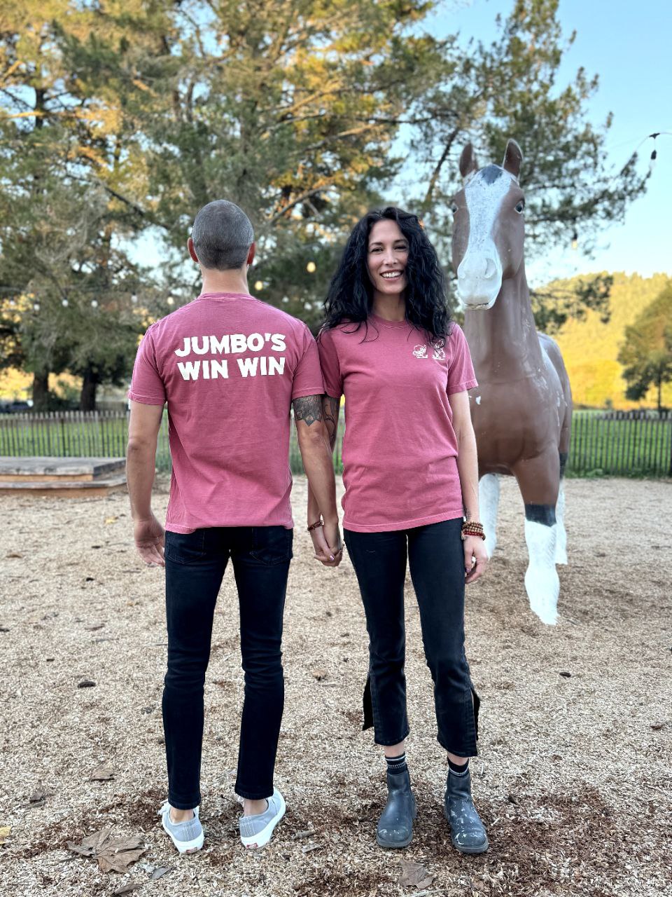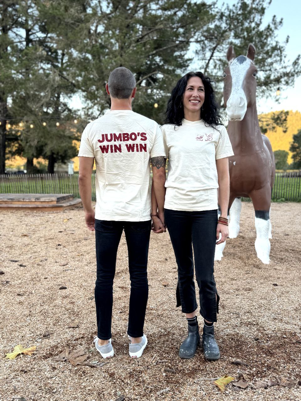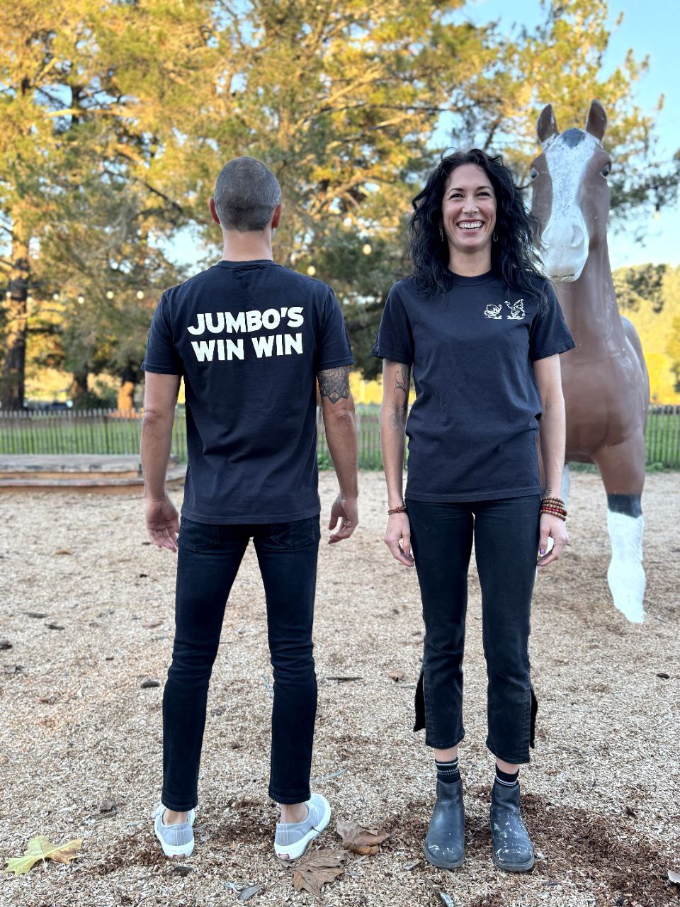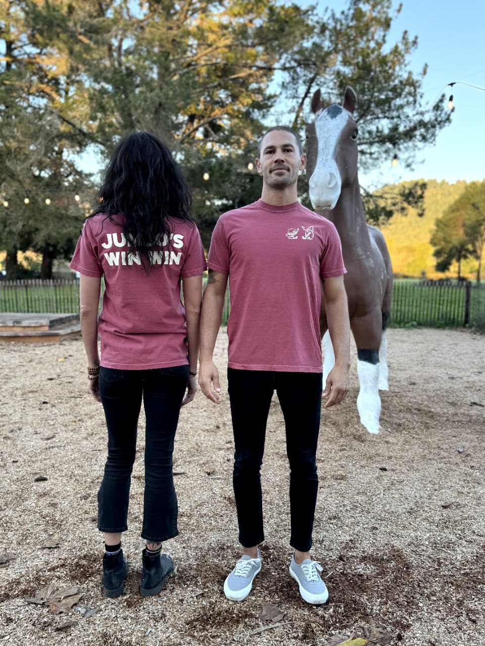 This t-shirt features a variety of designs: Jumbo’s Win Win in black, ivory, and red, The Donna’s on green, ‘You’re Doing Great’ on cameo, sharks on grey and lavender, ‘ice cream and burger’ on white – please see the product photos for examples.