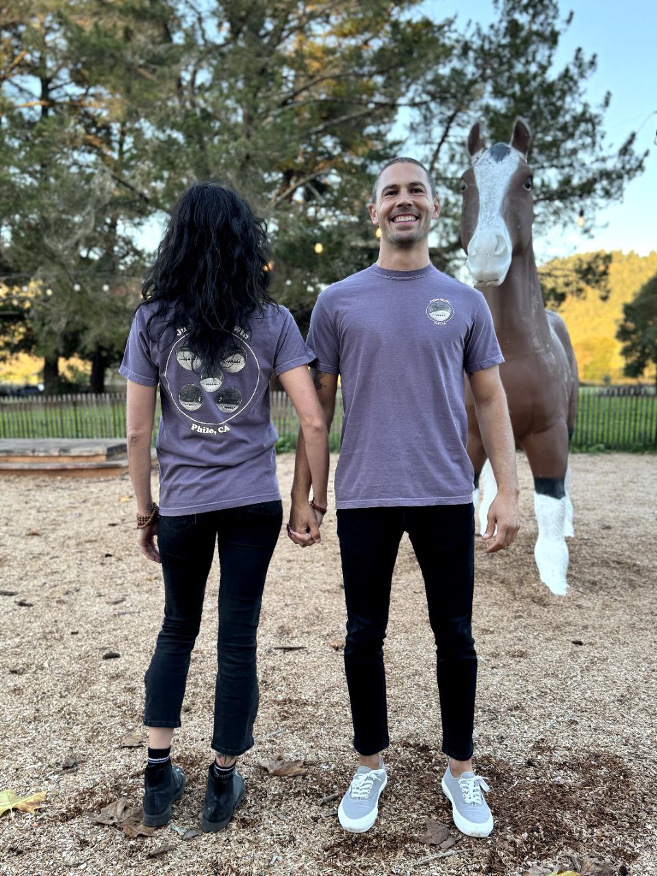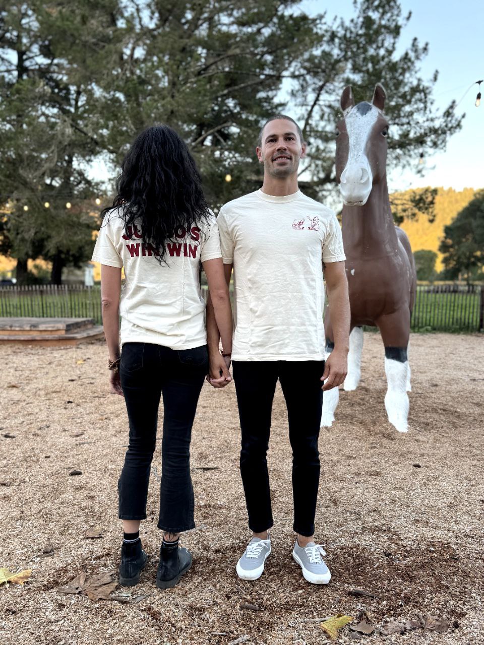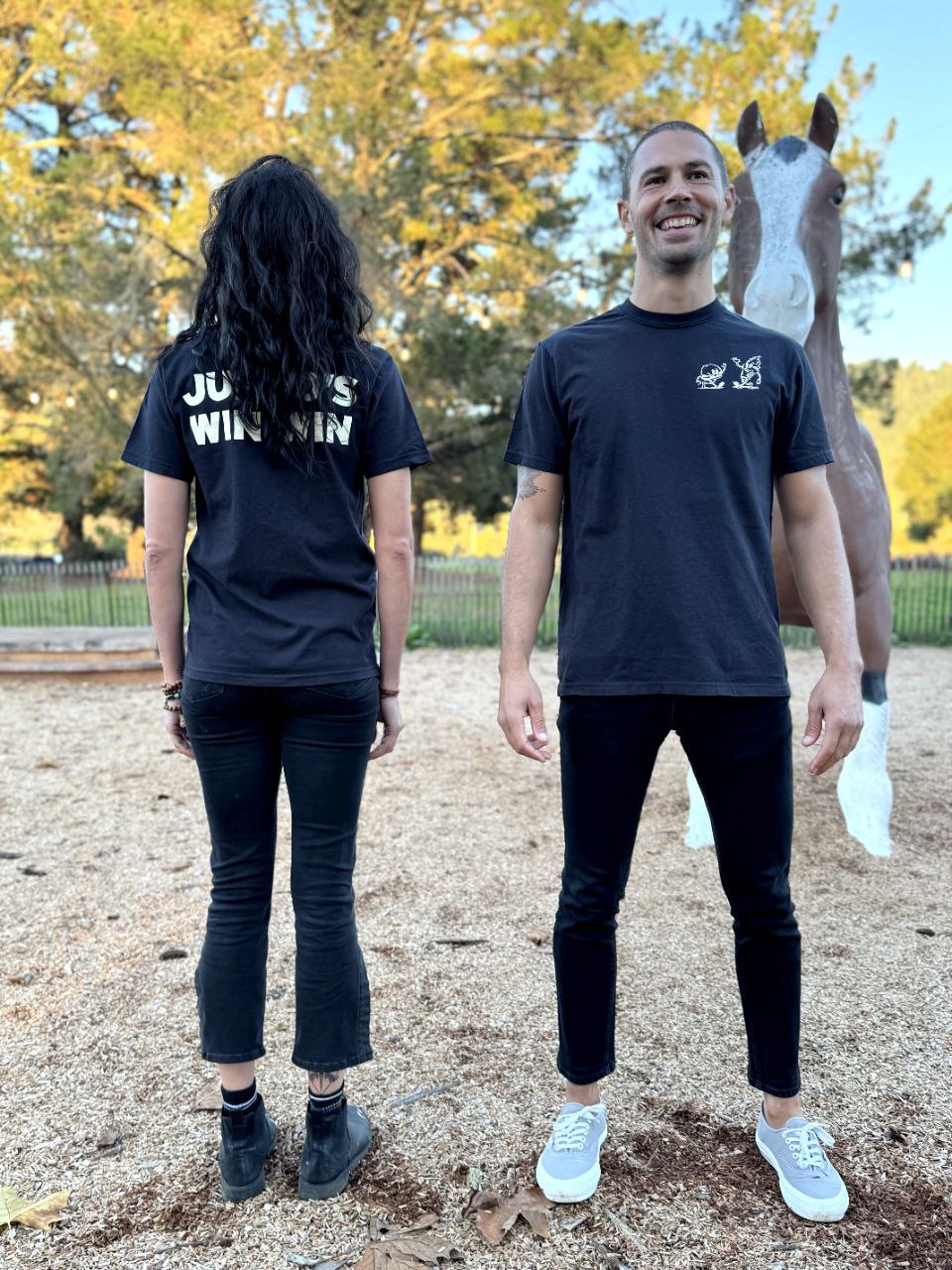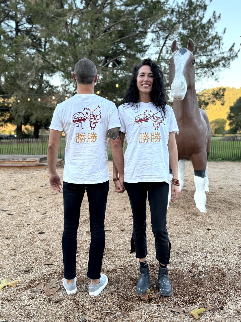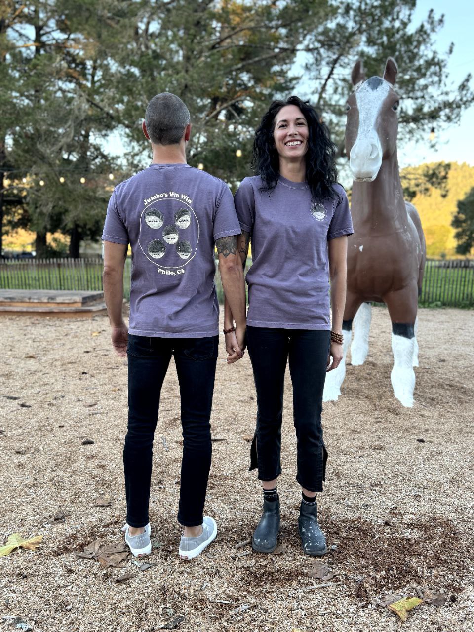 This t-shirt features a variety of designs: Jumbo’s Win Win in black, ivory, and red, The Donna’s on green, ‘You’re Doing Great’ on cameo, sharks on grey and lavender, ‘ice cream and burger’ on white – please see the product photos for examples.